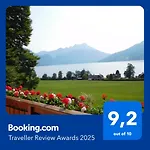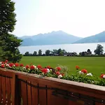 部屋からは湖の景色が望めます. Haus Baderアパ-トメントアパ-トは個別のトイレ とシャワ-を完備したプライベ-トなバスル-ムを有しています.